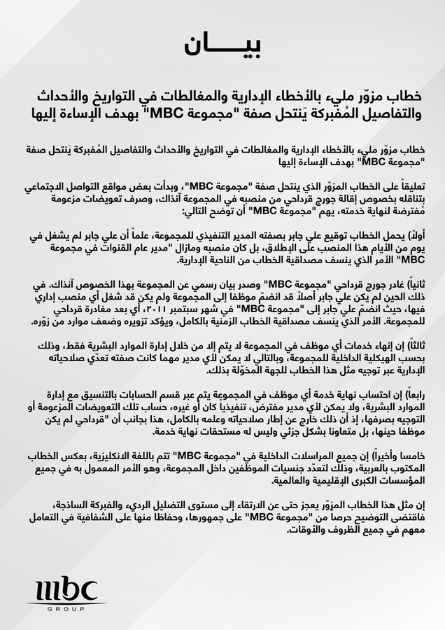 وأوضحت "مجموعة MBC" أن الخطاب المتداول "يحمل توقيع علي جابر بصفته المدير التنفيذي للمجموعة، علما أن علي جابر لم يشغل في يوم من الأيام هذا المنصب على الإطلاق، بل كان منصبه وما زال "مدير عام القنوات في مجموعة MBC" الأمر الذي ينسف مصداقية الخطاب من الناحية الإدارية".