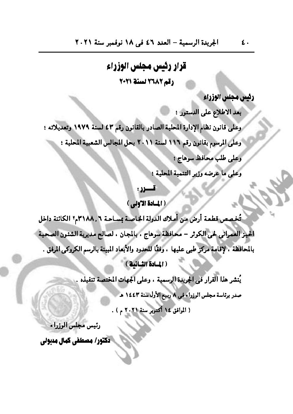 والقرار رقم 2682 لسنة 2021، بتخصيص قطعة أرض من أملاك الدولة الخاصة الكائنة داخل الحيز العمراني لحي الكوثر بمحافظة سوهاج، بالمجان، لإقامة مركز طبي عليها.