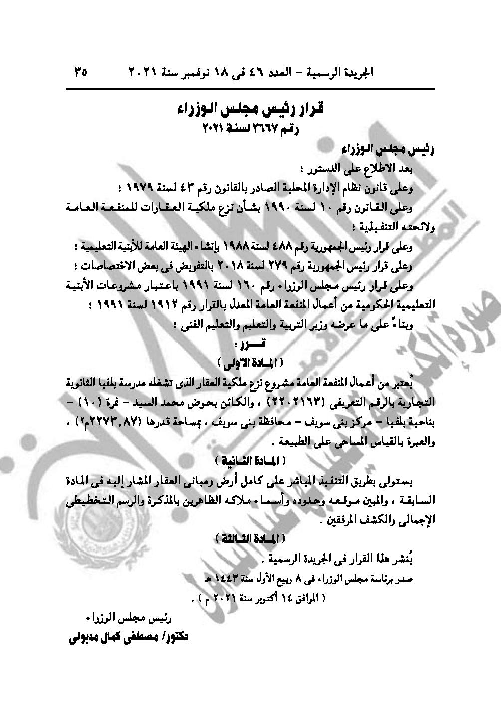 القرار رقم 2667 لسنة 2021، باعتبار مشروع نزع ملكية العقار الذي تشغله مدرسة بلفيا الثانوية التجارية، بناحية بلفيا مركز بني سويف محافظة بني سويف، من أعمال المنفعة العامة.