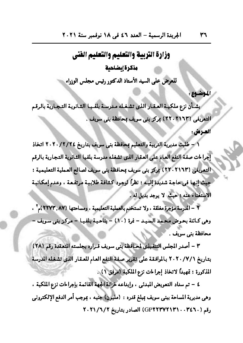 نشرت الجريدة الرسمية في عددها رقم 46، الصادر في 18 فبراير 2021، 3 قرارات لرئيس مجلس الوزراء الدكتور مصطفى مدبولي باعتبار نزع ملكية عقار تشغله مدرسة بلفيا الثانوية التجارية ببني سويف منفعة عامة، وتخصيص أراضي من أملاك الدولة بالمجان، لإقامة مركز طبي، وإقامة مبنى للضرائب العقارية في سوهاج.
