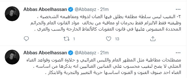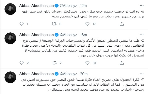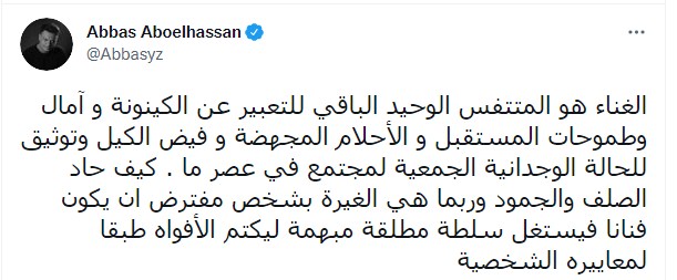 وكتب عباس أبو الحسن تغريدة على تويتر "الغناء هو المتنفس الوحيد الباقي للتعبير عن الكينونة وآمال وطموحات المستقبل والأحلام المجهضة وفيض الكيل وتوثيق للحالة الوجدانية الجمعية لمجتمع في عصر ما. كيف حاد الصلف والجمود وربما هي الغيرة بشخص مفترض ان يكون فنانا فيستغل سلطة مطلقة مبهمة ليكتم الأفواه طبقا لمعاييره الشخصية"