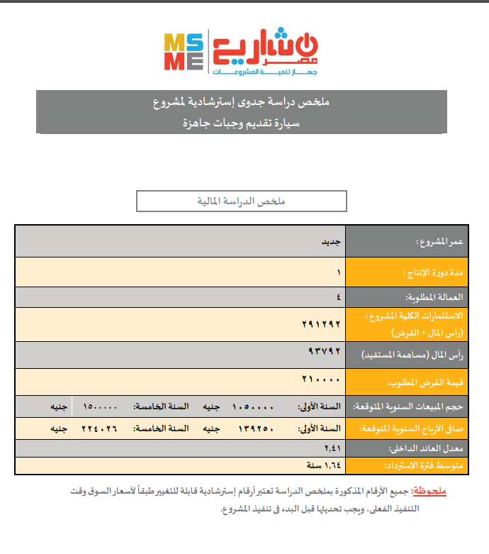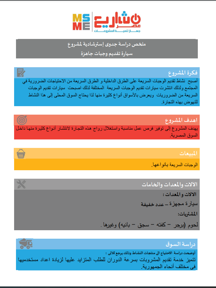 ونقدم اليوم كافة التفاصيل المتعلقة لملخص دراسة جدوى استرشادية لمشروع سيارة تقديم وجبات جاهزة