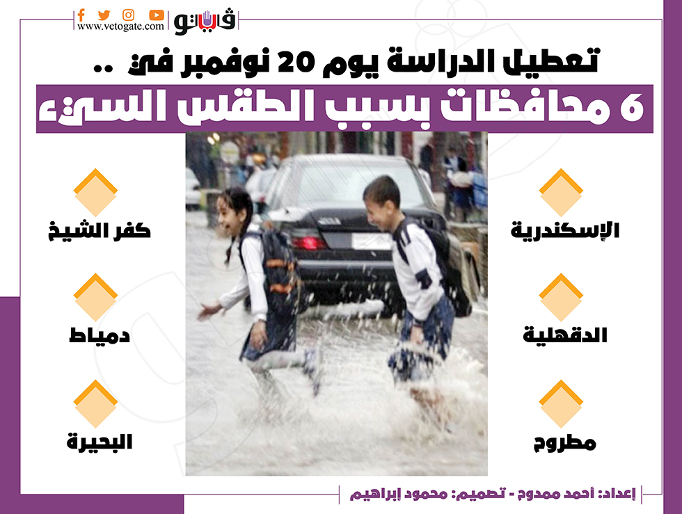 تعطيل الدراسة يوم 20 نوفمبر في 6 محافظات بسبب سوء الطقس| إنفوجراف الخميس 18/نوفمبر/2021 - 08:57 م 11/18/2021 8:57:47 PM أحمد ممدوح شارك طباعة 18 حجم الخط شارك طباعة حالة الطقس السيء تعليق الدراسة البحيرة دمياط كفر الشيخ موجة الأمطار
