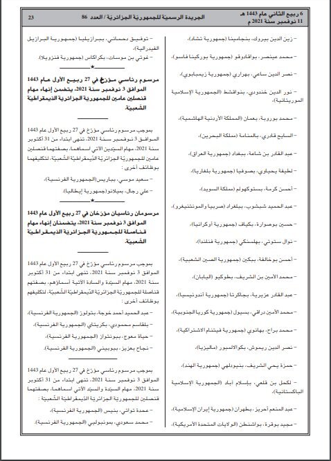 كما تضمن العدد مرسومًا آخر أنهيت بموجبه مهام القناصل في تولوز عبد الحميد أحمد خوجة، وفي كريتاي بلقاسم محمودي، وفي بونتوار حياة معوج، وفي بوبيني نجاح بعزيز.