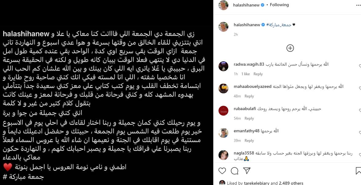 وكتبت حلا شيحة على موقع الصور والفيديوهات القصيرة انستجرام، وقالت: زي الجمعة دي الجمعة اللي فاتت، كنا معاكي يا علا وأنت بتتزيني للقاء الخالق من وقتها بسرعة، وأهو عدى أسبوع والنهاردة تاني جمعة، إزاي الوقت بقى سريع كدة، الواحد بقا عنده كمية طول أمل في الدنيا دي لا ينتهي، فعلا الوقت بيبان كأنه طويل ولكنه في الحقيقة بسرعة البرق.