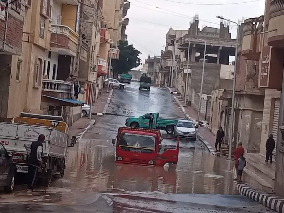 وأغلقت مياه الأمطار عددًا من شوارع مدينة العريش بسبب تراكمها بوسط الطرق وعدم وجود سيارات لشفط المياه ما أدى إلى صعوبة سير السيارات واتخاذ طرق بديلة أخرى.