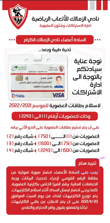 وتنوه إدارة الاشتراكات بضرورة إحضار الأعضاء صورة ضوئية من بطاقة الرقم القومي لإجراء تحديث البيانات وربط التعاملات المالية برقم الفيزا الخاص بكارنيه العضوية.. كما يرجى إحضار إيصال السداد أثناء تسلم الكارنيهات.