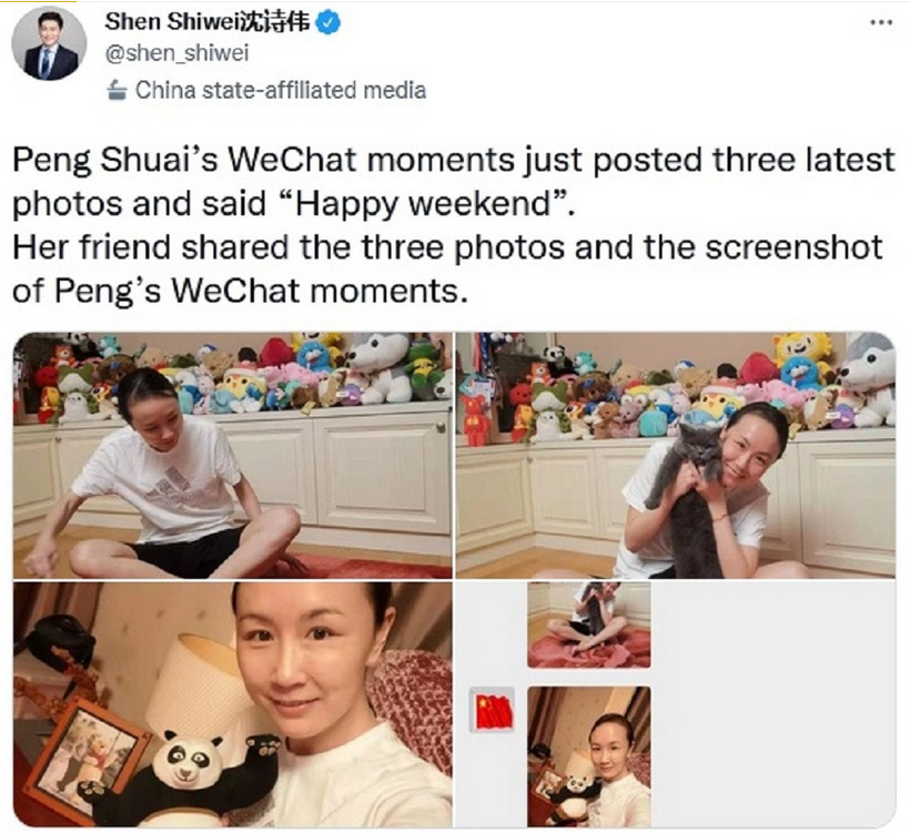 نشر أحد الصحفيين الصينيين العاملين في وكالة إعلامية تابعة للحكومة الصينية صورا للاعبة التنس الصينية بينج شواي التي اختفت أخبارها منذ 2 نوفمبر نتيجة اتهامها لعضو بارز في السلطة الصينية بإجبارها على ممارسة الجنس.