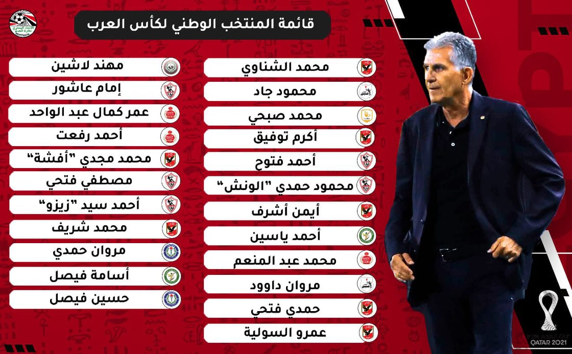 أعلن البرتغالي كارلوس كيروش مدرب المنتخب المصري لكرة القدم، قائمة الفراعنة التي ستشارك ببطولة كأس العرب والتي ستقام خلال الفترة من 30 نوفمبر إلى 18 ديسمبر.