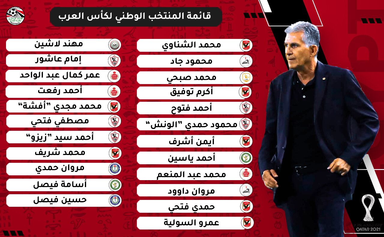 أعلن الجهاز الفني لـ منتخب مصر الوطني بقيادة البرتغالي كارلوس كيروش قائمة اللاعبين النهائية المشاركين في بطولة كأس العرب المقرر إقامتها بالدوحة خلال الفترة من 30 نوفمبر الحالي وحتى 18 ديسمبر المقبل.