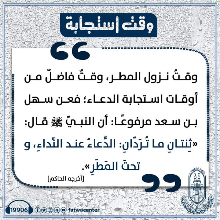 أوضح مركز الأزهر العالمي للفتوى الإلكترونية، كيفية استقبال المسلم المطر والرياح، بالتزامن مع حالة الطقس السيء التي تشهدها البلاد حاليا، وأوضح مركز الأزهر العالمي للفتوى، أن وقت نزول المطر مستجاب الدعوة فيه.