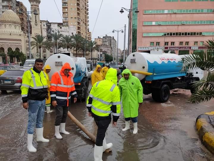 كثف العاملون ومسئولو هيئة الصرف الصحي بمحافظة الإسكندرية اليوم الأحد، من تواجدهم بكافة الميادين والشوارع العامة لرفع تراكمات مياة الأمطار الغزيرة المتراكمة في الطرقات.