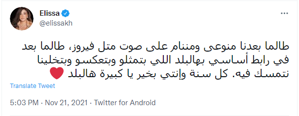 وكتبت إليسا قائلة: "طالما بعدنا منوعى ومننام على صوت متل فيروز، طالما بعد في رابط أساسي بهالبلد اللي بتمثلو وبتعكسو وبتخلينا نتمسك فيه. كل سنة وإنتي بخير يا كبيرة هالبلد".