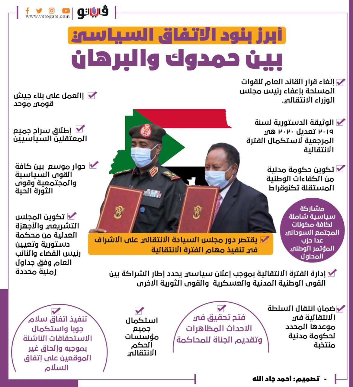 أبرز بنود الاتفاق السياسي بين حمدوك والبرهان|انفوجراف الأحد 21/نوفمبر/2021 - 11:48 م 11/21/2021 11:48:24 PM السلطة السودانية شارك طباعة 18 حجم الخط شارك طباعة السودان عبد الفتاح البرهان عبد الله حمدوك مجلس السيادة الانتقالي اتفاق سلام جوبا تفكيك نظام الإخوان