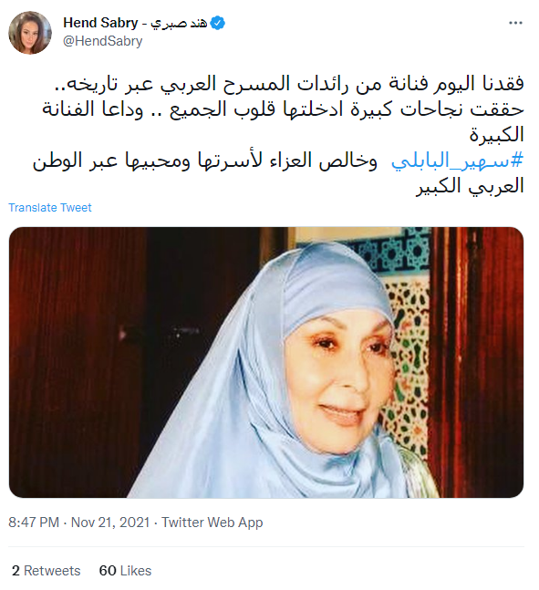 وكتبت هند صبري قائلة: "فقدنا اليوم فنانة من رائدات المسرح العربي عبر تاريخه.. حققت نجاحات كبيرة ادخلتها قلوب الجميع.. وداعا الفنانة الكبيرة.. #سهير_البابلي وخالص العزاء لأسرتها ومحبيها عبر الوطن العربي الكبير".