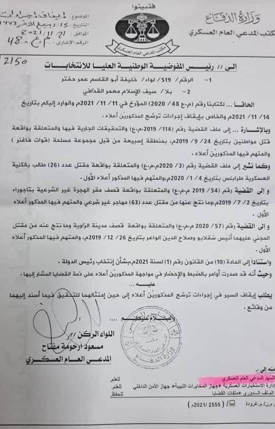 طالب المدعي العام العسكري في ليبيا اللواء مسعود أرحومة مفتاح بوقف إجراءات ترشيح سيف الإسلام القذافي وخليفة حفتر للانتخابات الرئاسية.
