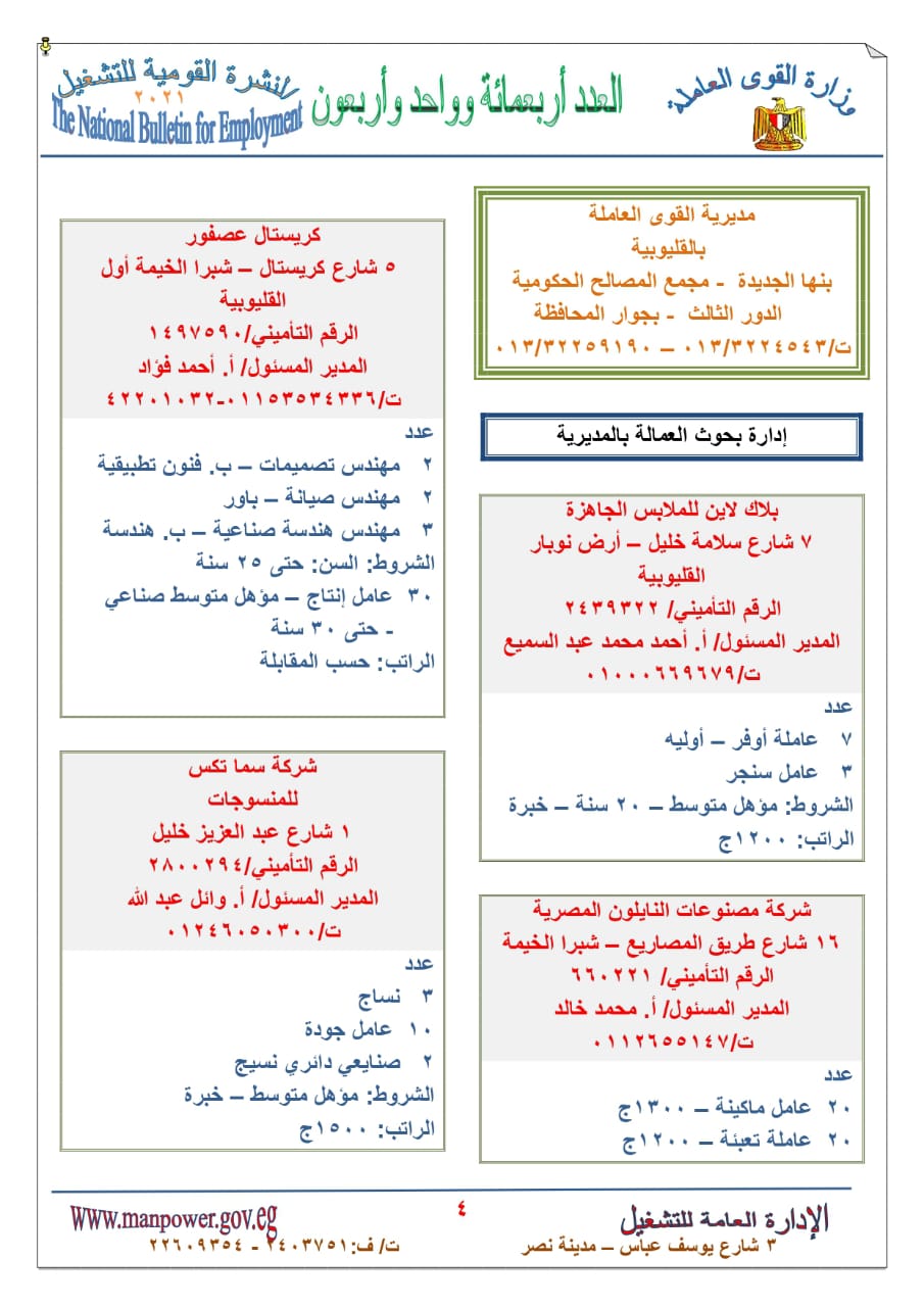 أما بورسعيد فقد وفرت فرص عمل متنوعة في العديد من المجالات ومنها: موظفة إدارية، و95 عامل خياطة، وعامل مخازن، و6 عمال، و3 فنى صيانة، و30 مساعد خياطة، وعامل مكواة.