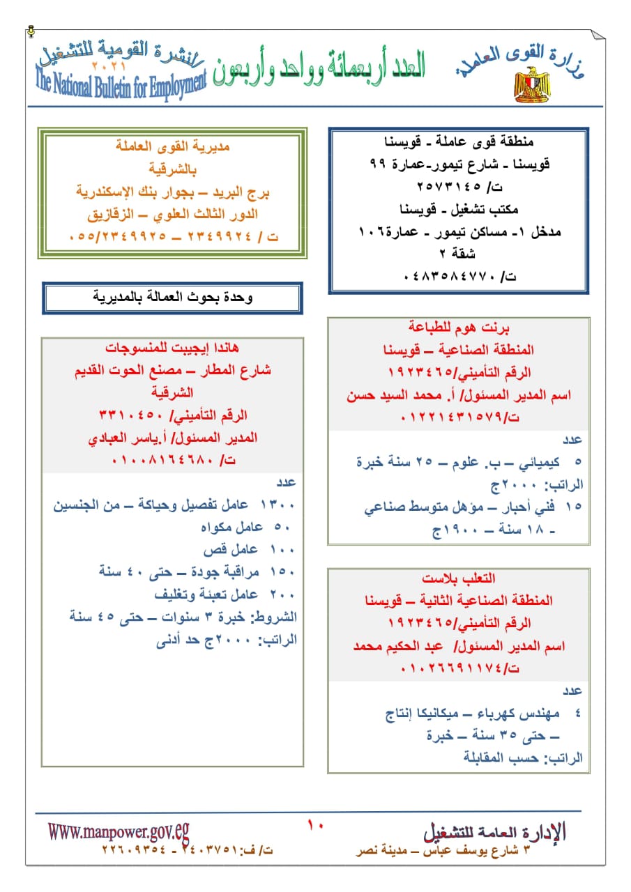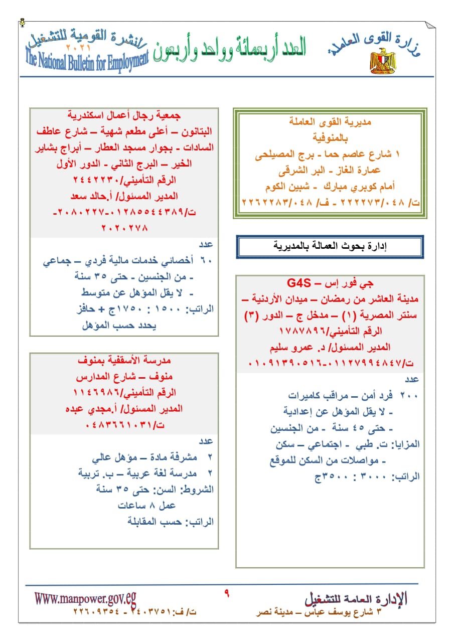 وهناك عدد من الوظائف في المنوفية تضمنت: 200 فرد أمن براتب 3500 جنيه، و2 مشرفة مادة، و2 مدرس لغة عربية، و60 أخصائي خدمات مالية ( فردي – جماعي )، و5 كيميائي، و15 فنى أحبار، و4 مهندس كهرباء وميكانيكا.