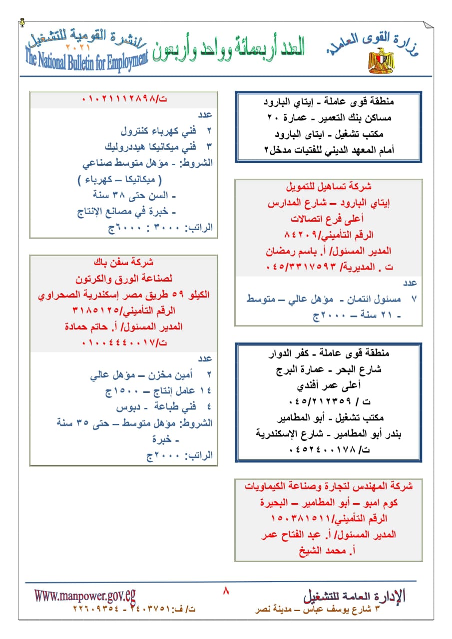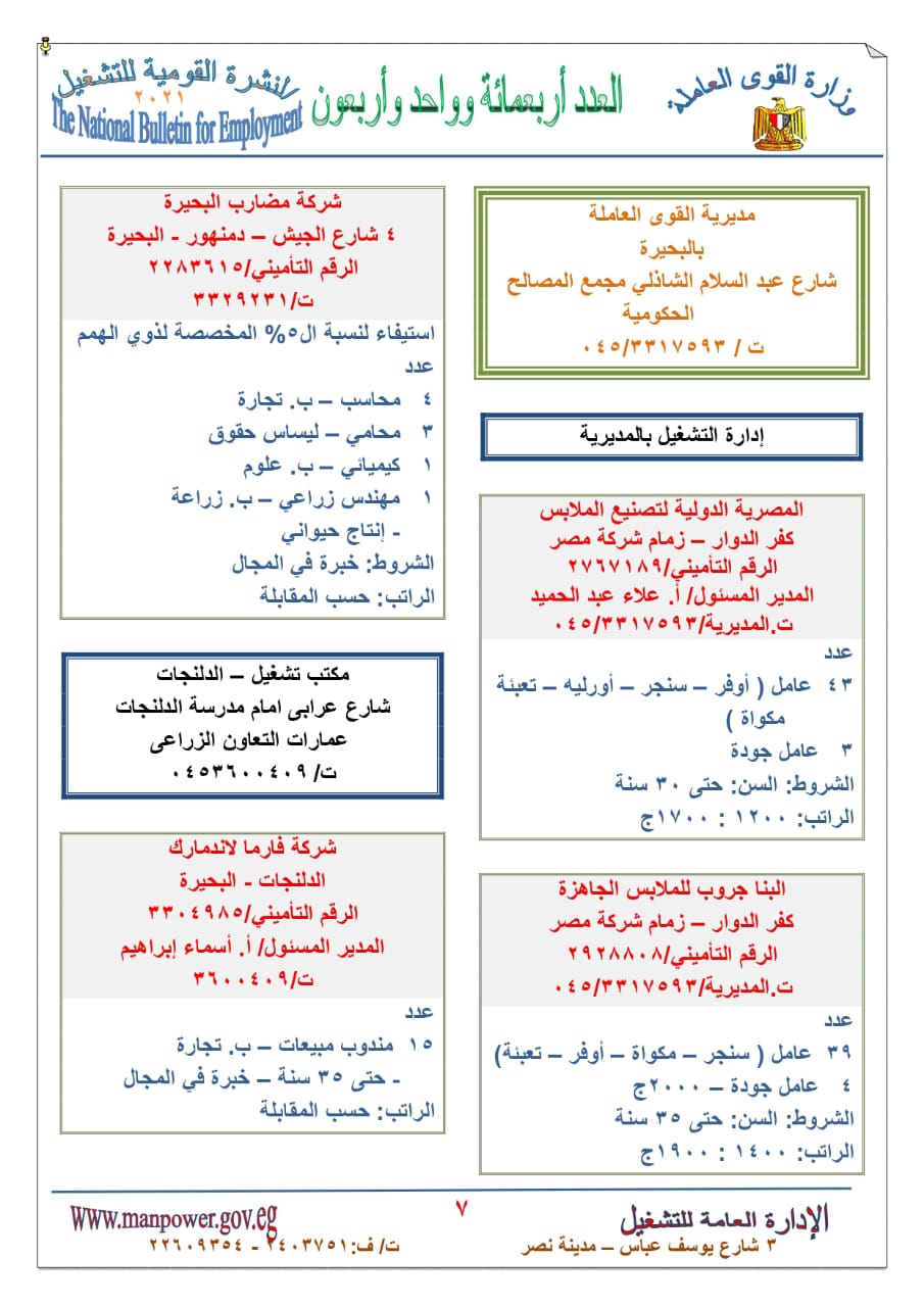 كما وفرت مديرية القوى العاملة بالبحيرة مجموعة من فرص العمل شملت: 82 عمال اوفر وسنجر واورليه ومكواة، و7 عمال جودة، و4 محاسبين، و3 محامي، وكيميائي، ومهندس زراعي، و15 مندوب مبيعات، و7 مسئول ائتمان، و2 فنى كهرباء كنترول، و2 أمين مخزن، و14 عمال انتاج، و3 فنى ميكانيكا، و4 فنى طباعة.