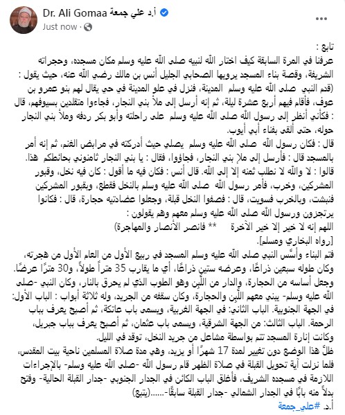 وكتب الدكتور علي جمعة تدوينة على الفيس بوك "عرفنا في المرة السابقة كيف اختار الله لنبيه صلى الله عليه وسلم مكان مسجده، وحجراته الشريفة، وقصة بناء المسجد يرويها الصحابي الجليل أنس بن مالك رضي الله عنه، حيث يقول: (قدم النبي صلى الله عليه وسلم المدينة، فنزل في علو المدينة في حي يقال لهم بنو عمرو بن عوف، فأقام فيهم أربع عشرة ليلة، ثم إنه أرسل إلى ملأ بني النجار، فجاءوا متقلدين بسيوفهم، قال: فكأني أنظر إلى رسول الله صلى الله عليه وسلم على راحلته وأبو بكر ردفه وملأ بني النجار حوله، حتى ألقى بفناء أبي أيوب".