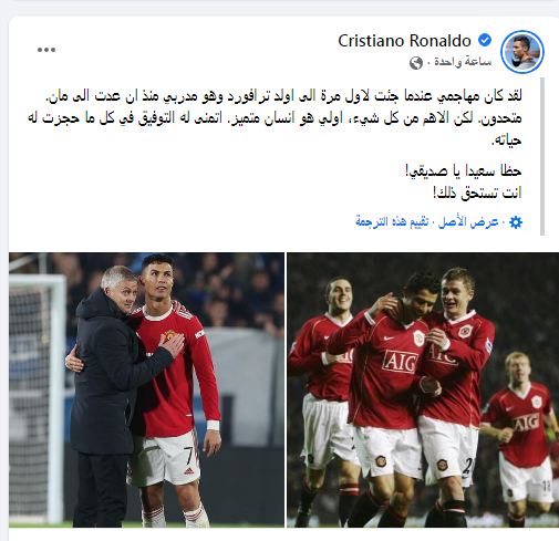 حرص البرتغالي كريستيانو رونالدو، نجم مانشستر يونايتد، على توجيه رسالة وداع إلى النرويجي أولي جونار سولشاير، المدير الفني السابق للشياطين الحمر.