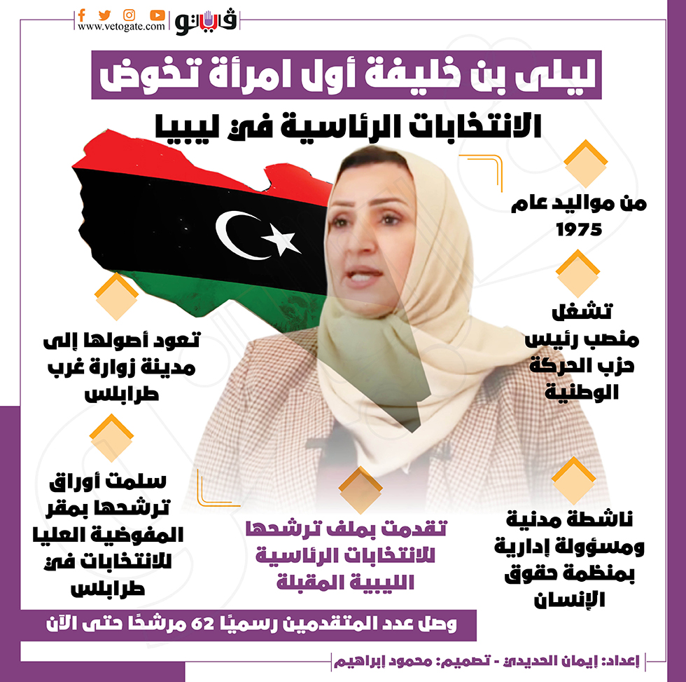 ليلى بن خليفة أول امرأة تخوض الانتخابات الرئاسية في ليبيا|إنفوجراف الإثنين 22/نوفمبر/2021 - 03:08 م 11/22/2021 3:08:31 PM ليلى بن خليفة أول امرأة تخوض الانتخابات الرئاسية في ليبيا إيمان الحديدى شارك طباعة 18 حجم الخط شارك طباعة المفوضية العليا للانتخابات ليبيا طرابلس ليلي بن خليفة زوارة