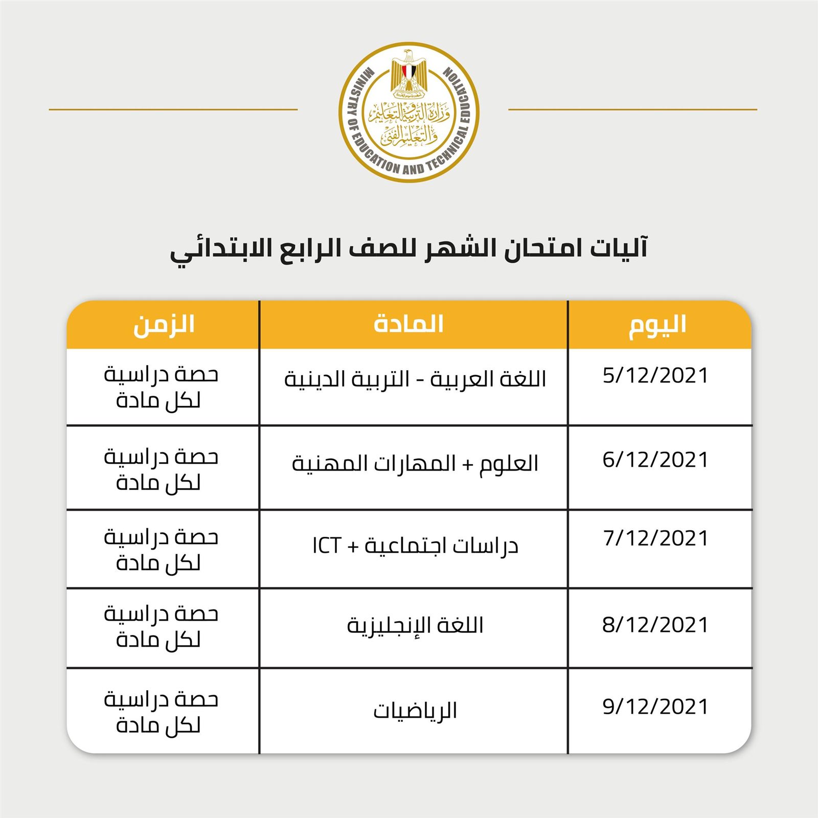 يبدأ 5 ديسمبر.. جدول امتحان شهري أكتوبر ونوفمبر لطلاب الصف الرابع الابتدائي