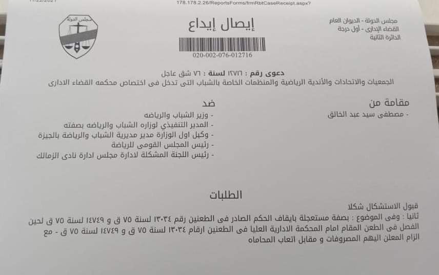 واختصم فيها كلًا من: الدكتور أشرف صبحي وزير الشباب والرياضة، وحسين لبيب رئيس اللجنة المكلفة برئاسة نادي الزمالك.