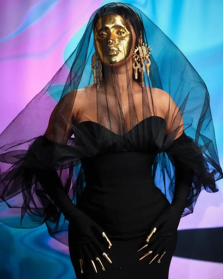 وكانت البداية مع كاردي بي التي خطفت الأنظار إليها بإطلالة استثنائية، اختارت فيها فستان أسود طويل من أكمام منفصلة من دار Schiaparelli ووضعت قناعًا ذهبي اللون غطى كامل وجهها مع أقراط كبيرة، فبدت إطلالتها غريبة.