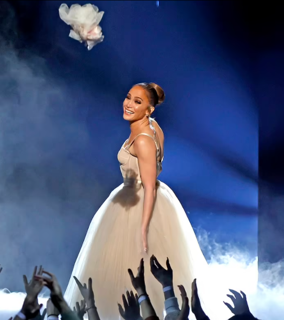 وبعيدًا عن السجادة الحمراء، بدت النجمة العالمية “جنيفر لوبيز” كعروس على مسرح AMAs، اذ ارتدت فستانًا باللون البيج متوسط الطول ووضعت على رأسها طرحة عروس قصيرة.