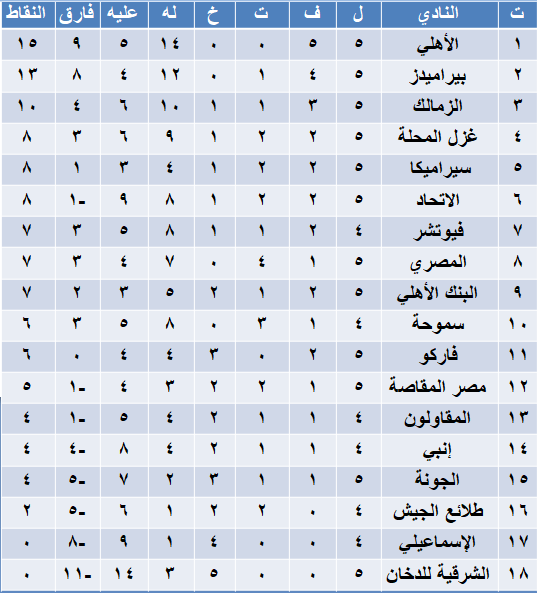 تنشر فيتو جدول ترتيب الدوري المصري الممتاز بعد فوز الأهلي علي غزل المحلة 3-2، وبيراكيدز علي الشرقية للدخان 3-0، والمصري علي الجونة 3-0، وتعادل الزمالك مع البنك الأهلي 1-1 في الجولة الخامسة للمسابقة.