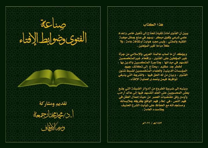 اعتمد الدكتور محمد مختار جمعة، وزير الأوقاف، طباعة كتاب "صناعة الفتوى وضوابط الإفتاء"، تقديم ومشاركة وزير الأوقاف.