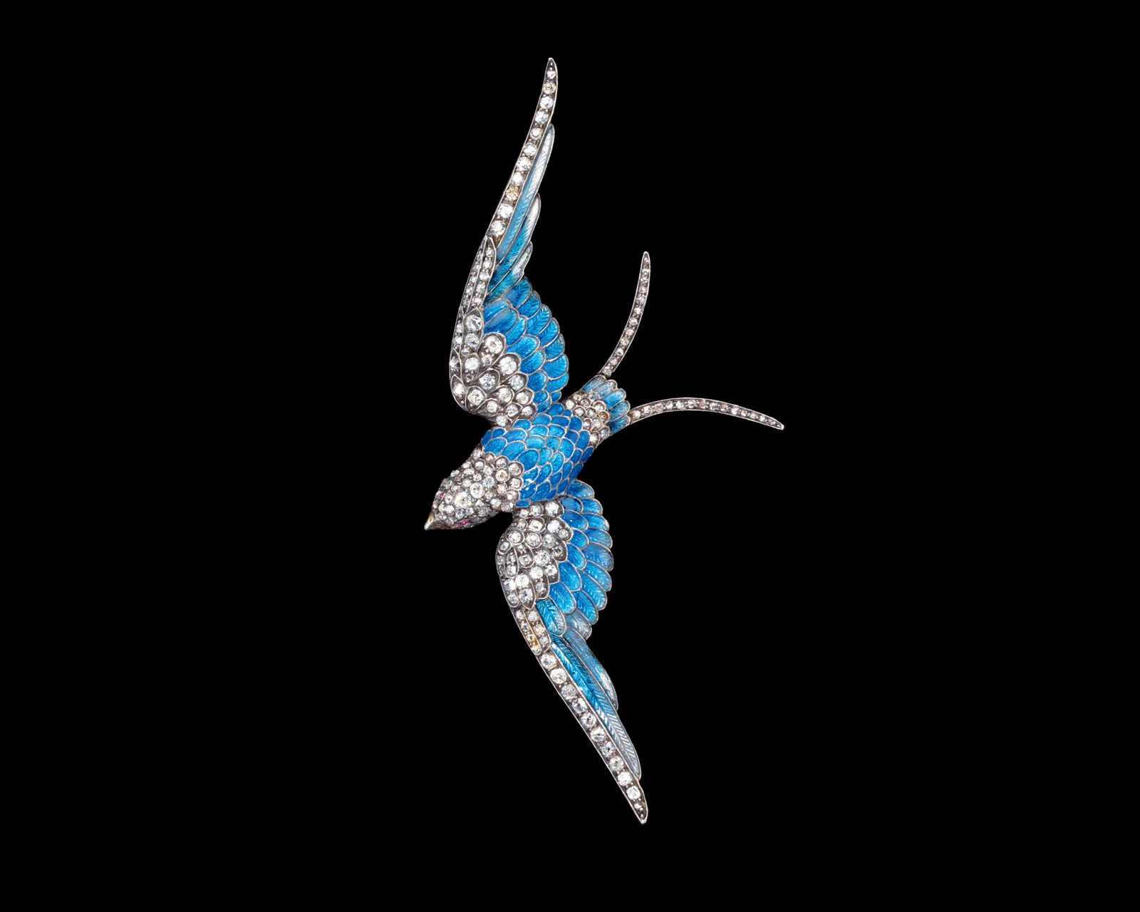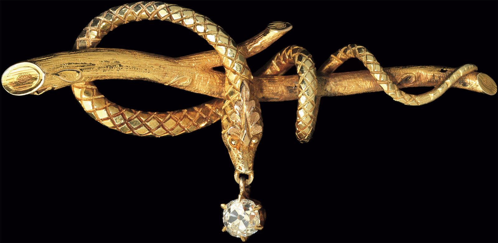 الدبوس مصنوع من الذهب الوردي (عيار 14 قيراطا) والفضة، مرصع بالماس والعقيق.
