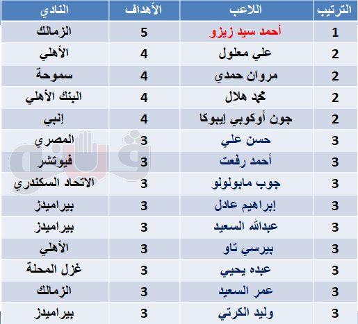 ويحتل أحمد سيد زيزو لاعب الزمالك صدارة ترتيب هدافي الدوري المصري الممتاز برصيد 5 أهداف بعد الجولة الخامسة ويليه علي معلول لاعب الأهلي ومروان حمدي لاعب سموحة ومحمد هلال لاعب البنك الأهلي وجون لإيبوكا لاعب إنبي ولكل منهما 4 أهداف.