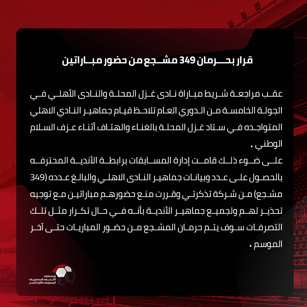 قررت رابطة الأندية المحترفة برئاسة أحمد دياب، حرمان 349 مشجعًا أهلاويًّا ممن حضروا لمؤازرة الفريق فى مباراته الأخيرة أمام غزل المحلة، من حضور المباراتين القادمتين للفريق الأحمر في مسابقة الدوري الممتاز.