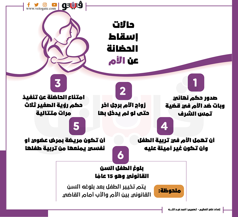حالات إسقاط الحضانة عن الأم l انفوجراف الأحد 28/نوفمبر/2021 - 07:45 م 11/28/2021 7:45:07 PM طفل على الحكيم شارك طباعة 18 حجم الخط شارك طباعة محكمة الأسرة حالات اسقاط الحضانة عن الأم أحكام الطلاق الحوادث اخبار الحوادث