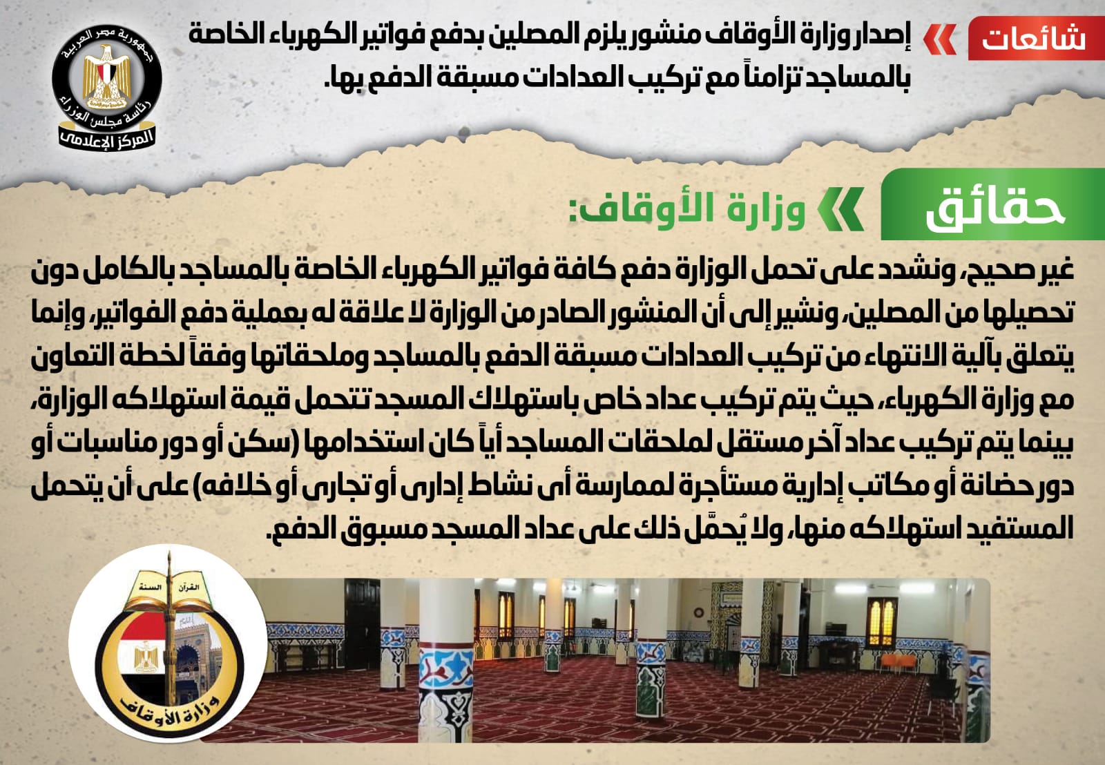 رصد المركز الإعلامي بمجلس الوزراء تداول أنباء بشأن إصدار وزارة الأوقاف منشورًا يلزم المصلين بدفع فواتير الكهرباء الخاصة بالمساجد تزامنًا مع تركيب العدادات مسبقة الدفع بها.