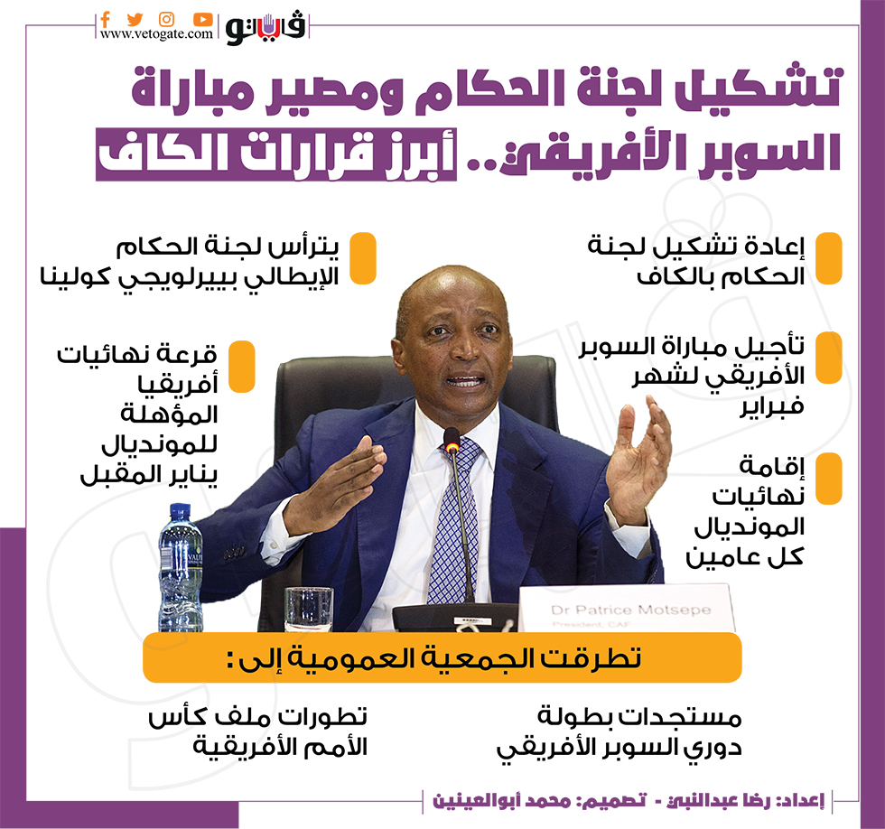 تشكيل لجنة الحكام ومصير مباراة السوبر الأفريقي.. أبرز قرارات الكاف | إنفوجراف الجمعة 26/نوفمبر/2021 - 02:41 م 11/26/2021 2:41:16 PM رضا عبدالنبى شارك طباعة 18 حجم الخط شارك طباعة كاف مباراة السوبر الافريقي الكاف السوبر الأفريقي مباراة السوبر قرارات الكاف
