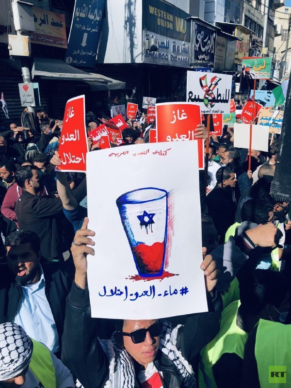 انتفض الشعب الأردني في تظاهرة احتجاجية اعتراضا على اتفاقية المياه مقابل الطاقة التي وقعتها عمان مع إسرائيل والإمارات، والتي يسمح من خلالها بشراء الماء من إسرائيل.