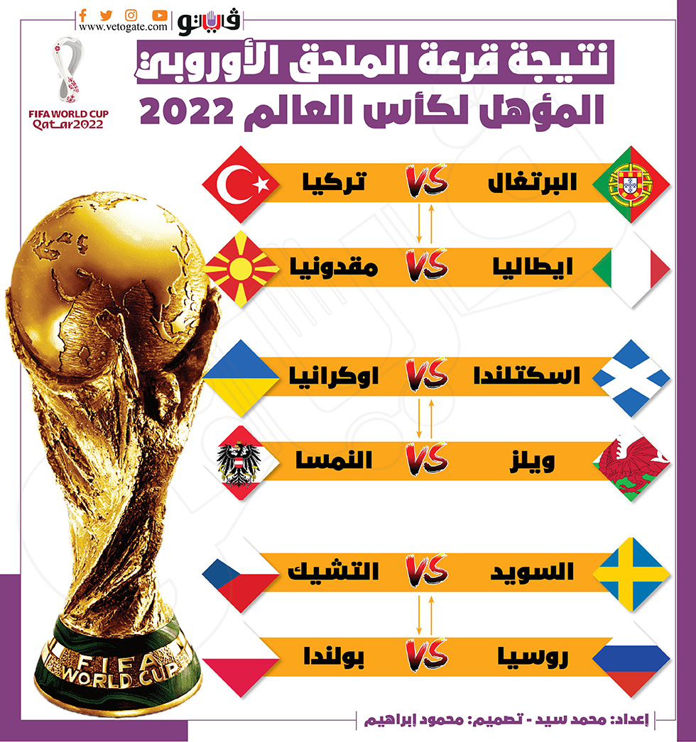 نتيجة قرعة الملحق الأوروبي المؤهل لكأس العالم 2022 | انفوجراف السبت 27/نوفمبر/2021 - 03:15 م 11/27/2021 3:15:00 PM نتيجة قرعة الملحق الأوروبي المؤهل لكأس العالم 2022 محمد سيد شارك طباعة 18 حجم الخط شارك طباعة السويد روسيا قطر أوكرانيا تركيا التشيك البرتغال إيطاليا بولندا كأس العالم 2022 النمسا كأس العالم في قطر مقدونيا الملحق الأوروبي