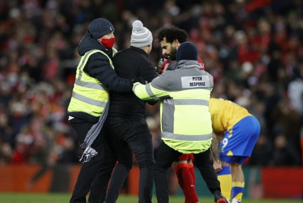 اقتحم مشجع الملعب في محاولة منه لالتقاط الصور مع نجم ليفربول محمد صلاح، بعد انتهاء مباراة الفريق أمام ضيفه ساوثهامبتون (4-0) مساء اليوم السبت، ضمن الجولة 13 من الدوري الإنجليزي الممتاز - البريميرليج.