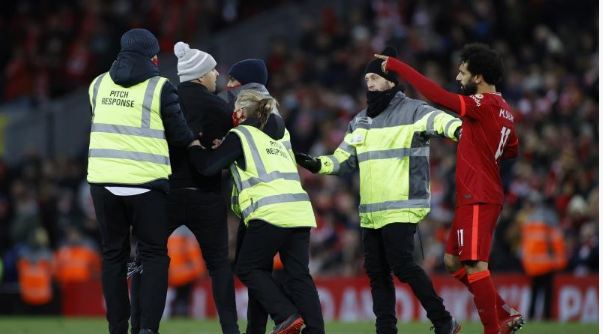 ومع صافرة النهاية، ركض مشجع من ليفربول على أرضية الميدان، متوجهًا نحو محمد صلاح الذي تفاجأ باقتحامه الملعب.