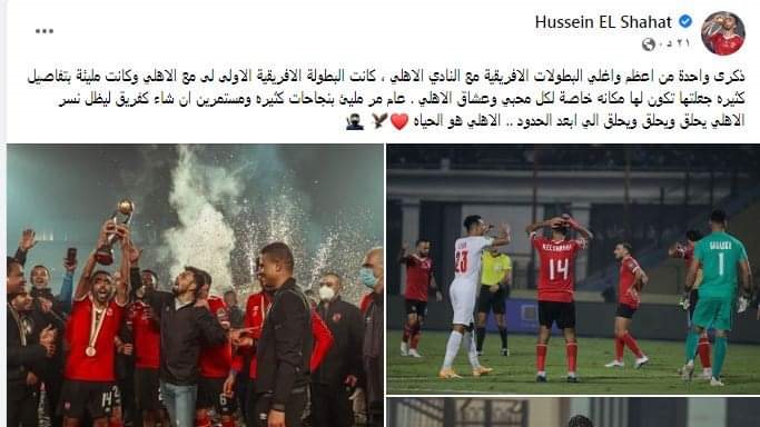 ونشر حسين الشحات صور له مباراة نهائي دوري أبطال أفريقيا أمام الزمالك عبر حسابه الشخصي على موقع التواصل الاجتماعي فيس بوك وعلق عليه قائلا: "ذكرى واحدة من أعظم وأغلى البطولات الأفريقية مع النادي الأهلي، كانت البطولة الأفريقية الأولى لي مع الأهلي وكانت مليئة بتفاصيل كثيرة جعلتها تكون لها مكانة خاصة لكل محبي وعشاق الأهلي. عام مر مليء بنجاحات كثيرة ومستمرين إن شاء الله كفريق ليظل نسر الأهلي يحلق ويحلق ويحلق إلى أبعد الحدود.. الأهلي هو الحياة".