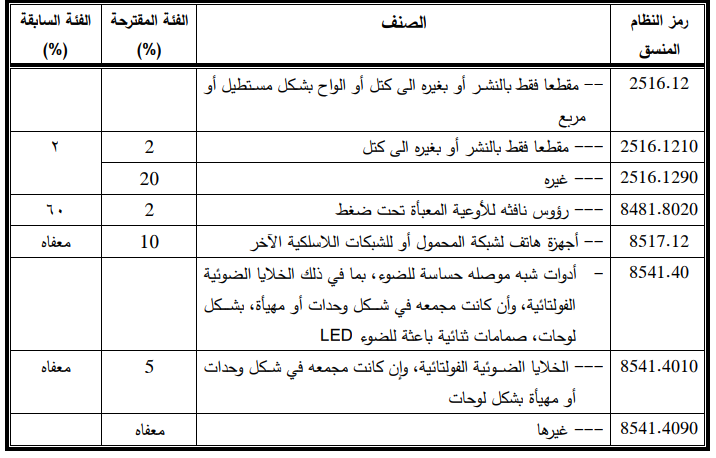 وإفراد فقرة محلية من البند الجمركي الدولي 8481.80 لتتضـمن الفقرة الفرعية صـنف " رؤوس نافثة للأوعية المعبأة تحت ضغط " بفئة جمركية ٢ % بدلا من 60 % باعتبارها من مستلزمات إنتاج لعدد من الصناعات. - إفراد فقرة محلية من البند الجمركي 2516.12 والمتضمن " جرانيت مقطعا فقط بالنشر أو إفراد فقرة محلية من البند الجمركي 2516.12 والمتضمن " جرانيت مقطعا فقط بالنشر أو بغيره " حرصا على تشجيع الصناعة الوطنية وعملا على تحديد العمليات الصناعية التي تمر بها مراحل الإنتاج للوصول الى المنتج النهائي لتشمل الفقرات المحلية الآتية: 2516.1210 --- مقطعا فقط بالنشر أو بغيره الى كتل بفئة وارد ٢ %. غیره بفئة وارد ۲۰ %.
