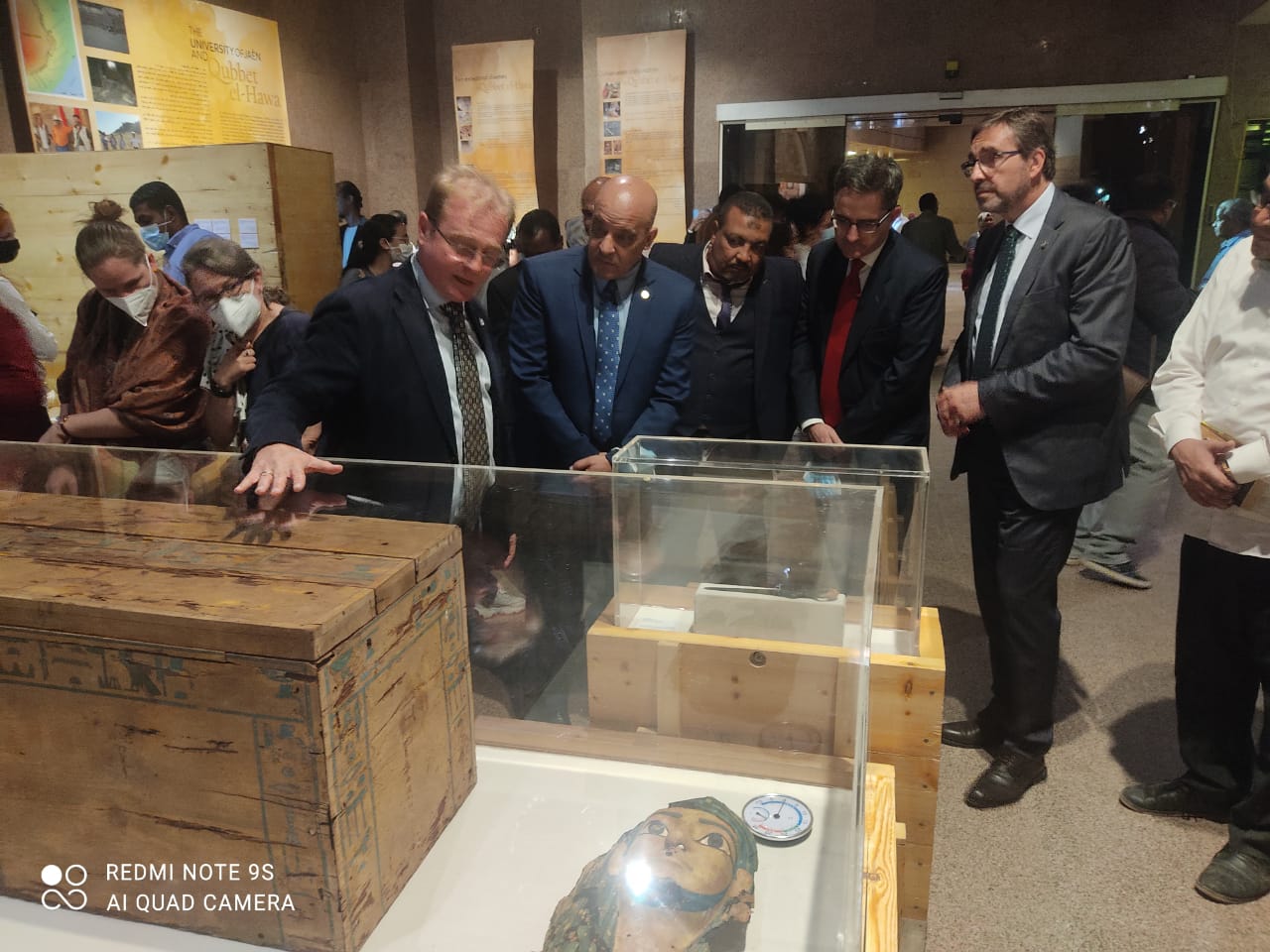 وحضر الافتتاح أيضا وفد إسباني رفيع المستوى على رأسه كانديدو كرييس المستشار الثقافي للسفارة الإسبانية بالقاهرة، والدكتور عبد المنعم سعيد مدير عام منطقة آثار أسوان والنوبة وياسر جاد الرب مدير عام مكتب وزارة السياحة بأسوان وعددًا من الأثريين والمرممين الذين شاركوا على مدار ثلاثة عشر عامًا من العمل الدؤوب بأعمال الحفائر بقبة الهوا وجزيرة الفنتين التي كانت جبانة لكبار الموظفين منذ النصف الثاني من الأسرة السادسة وحتى نهاية الأسرة الثانية عشر ليتوج عملهم بافتتاح هذا المعرض الذي يضم نحو 300 قطعة أثرية اكتشفتها البعثة الإسبانية بالتعاون مع وزارة السياحة والآثار المصرية منذ عام 2008.