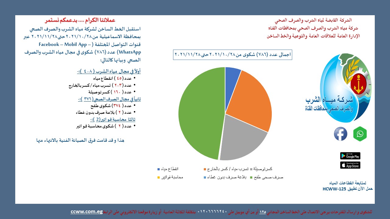 قالت شركة مياه الشرب والصرف الصحي بمحافظات القناة، إنها استقبلت خلال شهر نوفمبر 2021 عدد "904 " شكاوى واستفسارات من قبل المواطنين بمختلف قطاعات الشركة على مستوى محافظات القناة الثلاثة.