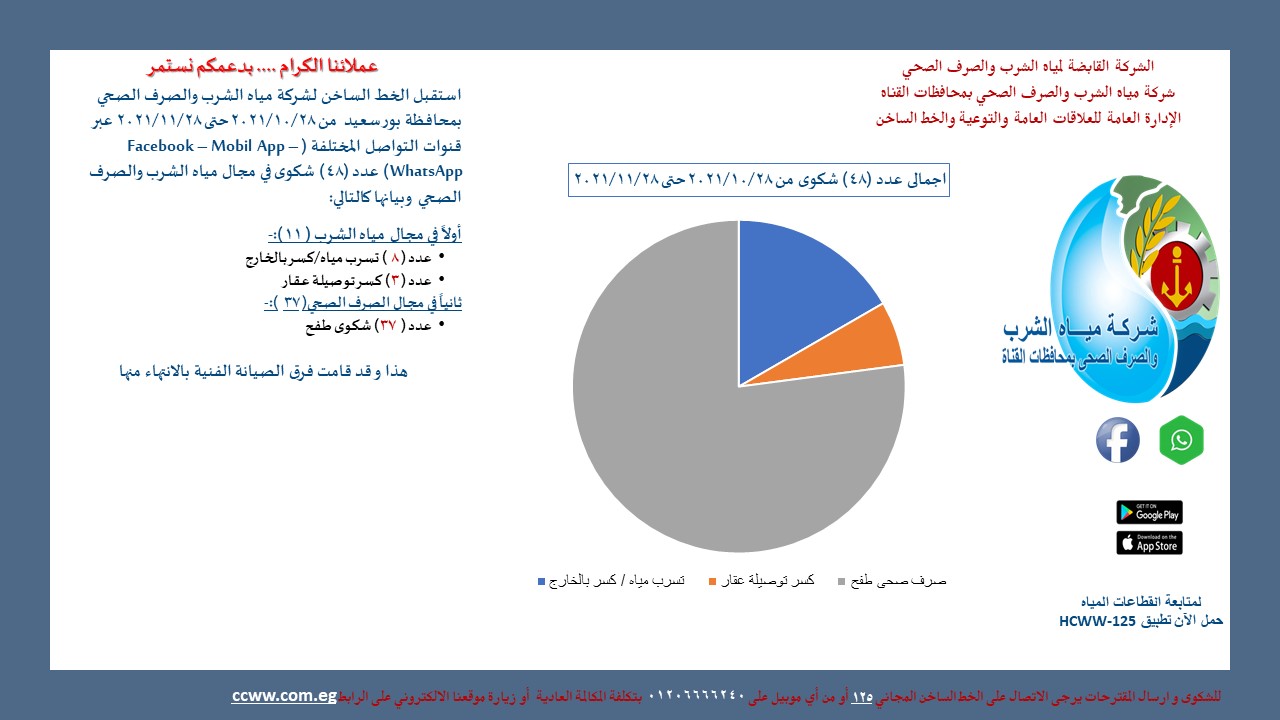 وقال اللواء عبد الحميد عصمت رئيس مجلس إدارة شركة مياه الشرب والصرف الصحي بمحافظات القناة إن الشركة تتلقى الشكاوى والاستفسارات عبر الخط الساخن 125 أو بوابة الشكاوى الحكومية التابعة لرئاسة مجلس الوزراء أو واتساب أو عبر مختلف وسائل الإعلام، والشكاوى الواردة عبر الصفحة الرسمية للشركة بالإضافة إلى الشكاوى المقدمة إلى مكتب خدمة المواطنين بالشركة والشكاوى التي يستقبلها فريق التوعية أثناء تواصله مع المواطنين.