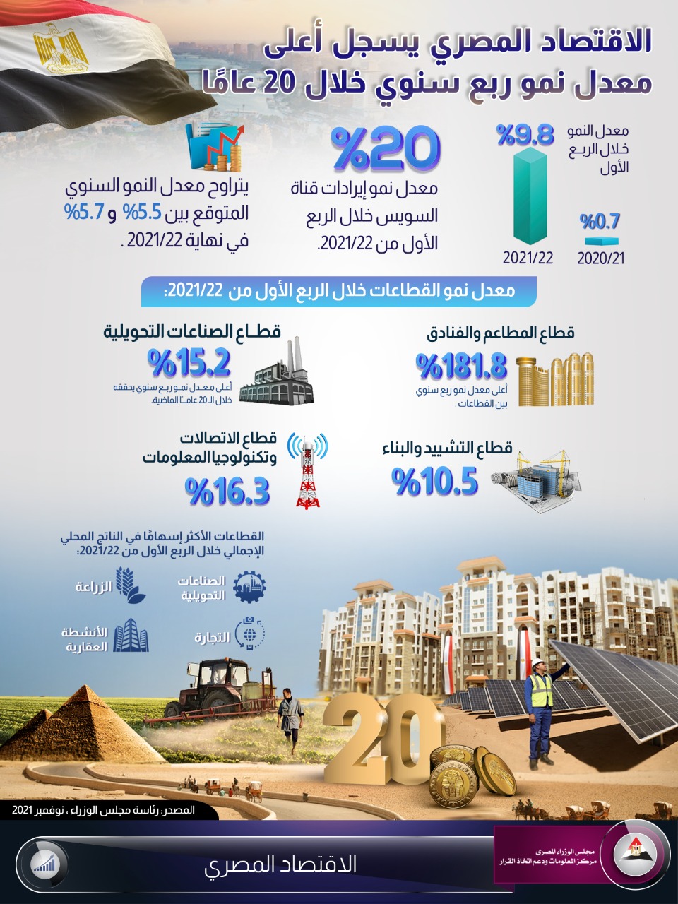 نشر مركز المعلومات ودعم اتخاذ القرار بمجلس الوزراء المصري إنفوجرافيك جديدًا بعنوان "الاقتصاد المصري يسجل أعلى معدل نمو ربع سنوي خلال 20 عامًا" يوضح من خلاله المؤشرات الأولية لأداء الاقتصاد المصري خلال الربع الأول من عام 2021/2022.