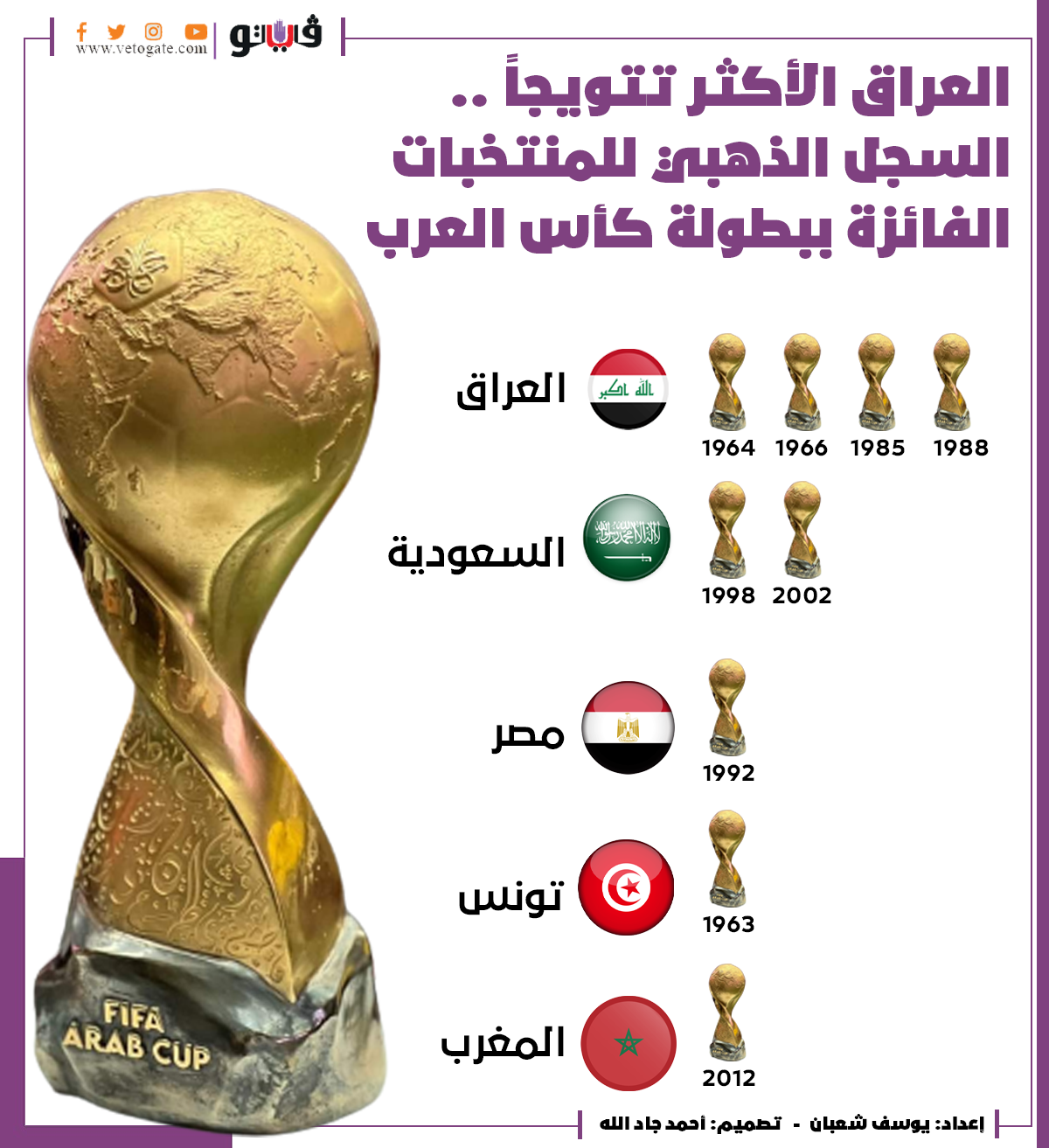 العراق الأكثر تتويجًا.. السجل الذهبي للمنتخبات الفائزة ببطولة كأس العرب| إنفوجراف الخميس 02/ديسمبر/2021 - 11:27 ص 12/2/2021 11:27:26 AM منتخب العراق يوسف شعبان شارك طباعة 18 حجم الخط شارك طباعة كأس العرب كأس العرب 2021 بقطر منتخب العراق منتخب السعودية منتخب مصر منتخب المغرب