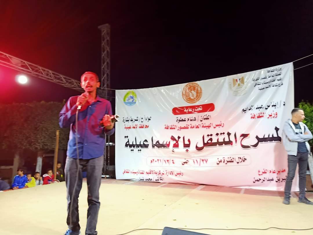 يستمر فرع ثقافة الإسماعيلية برئاسة شيرين عبد الرحمن التابع لإقليم القناة وسيناء الثقافي برئاسة الكاتب محمد نبيل رئيس إقليم القناة وسيناء، في فعاليات المسرح المتنقل الذي يجوب قرى المحافظة.
